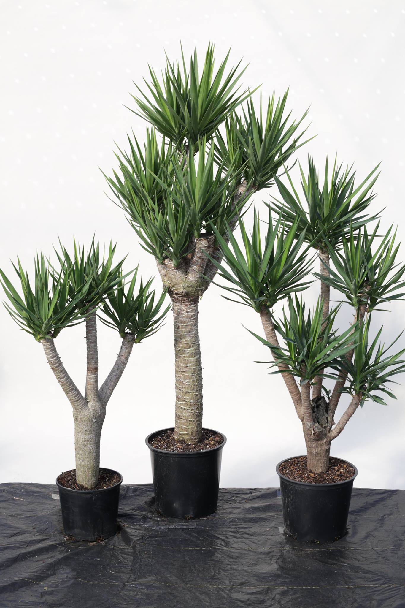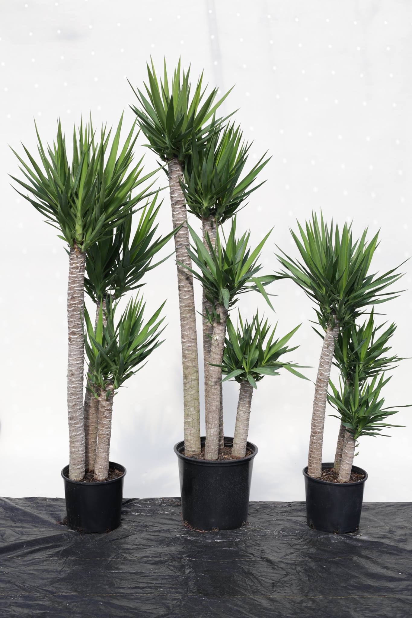 Generally available in staggered cutback canes or character branched trees, the Yucca is an excellent choice for interiors as it requires very little care. Prefers bright light applications. Yuccas are much happier being under-watered than overwatered.